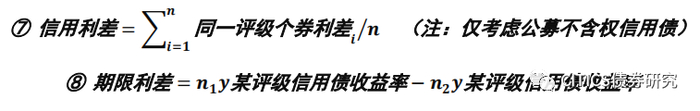 宏观视角下的信用利差和期限利差。微观和中观层面的各种利差本质上是不同分类下的个券利差集合,分类维度包括主体、行业、区域以及行政级别,理论上,如果将外部评级作为分类维度,可以构建出信用利差,计算方法如公式⑦所示。当然,利用中债发布的中短票到期收益率也可以计算信用利差,不过其采取的是隐含评级而非外部评级。与其他利差不同,期限利差并非建立在个券利差之上,而是建立在收益率的期限结构上,计算方法如公式⑧所示。信用利差和期限利差分别对应资质策略和久期策略,属于信用债投资的宏观视角。