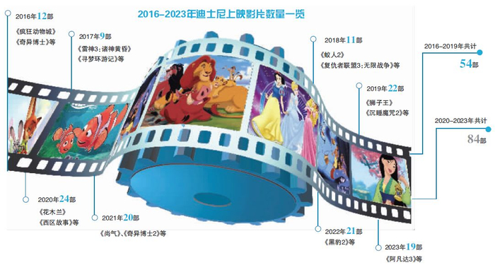 据片单显示,2020-2023年期间,迪士尼分别有24部、20部、21部和19部,共计84部作品计划上映。这与迪士尼在2016-2019年分别有12部、9部、11部和22部,共计54部作品相比,未来四年迪士尼推出的电影数量明显增加,并同比增长35.7%。
