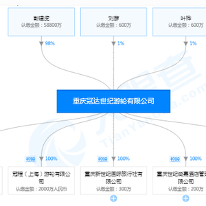 冠达世纪游轮除了游轮产业外,还对外有多项投资,分别为4家全资子公司重庆世纪尚嘉酒店管理有限公司(注册资本200万元)、冠程(上海)游轮有限公司(注册资本2000万元)、重庆新世纪国际旅行社有限公司(注册资本300万元)、重庆御辉房地产有限公司(注册资本1亿元)。