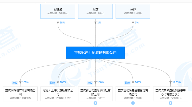 天眼查数据显示,冠达世纪游轮股权是今年10月29日发生变更,原股东彭俊珩退出,新增两名自然人股东刘彦和叶桦。