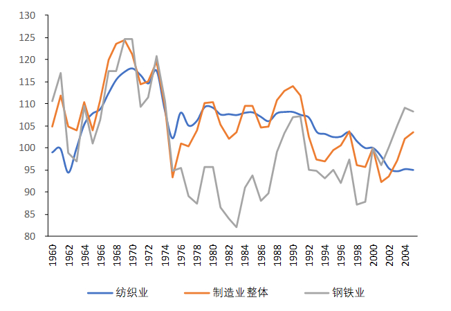 日本纺织业则是在70年代出现快速下行,钢铁在70、80年代左右下行至低位。从60年代到2000年初,制造业整体产能指数经历了两轮波动,其中,第二轮制造业产能指数的提升背景是高技术行业(机械相关)的产能指数上行。