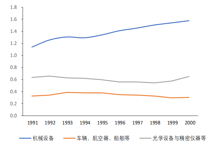 反观中国,在这个阶段,劳动密集型相关行业的RCA均出现了一定程度的上升,同时技术密集型行业的RCA也在缓步上升。