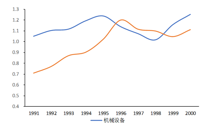 我们发现在90年代前半程,台湾与韩国均出现了劳动密集型行业RCA的快速下降,后半程RCA开始平稳。与此同时,技术密集型行业的RCA在这个阶段则出现了不同程度的上升。