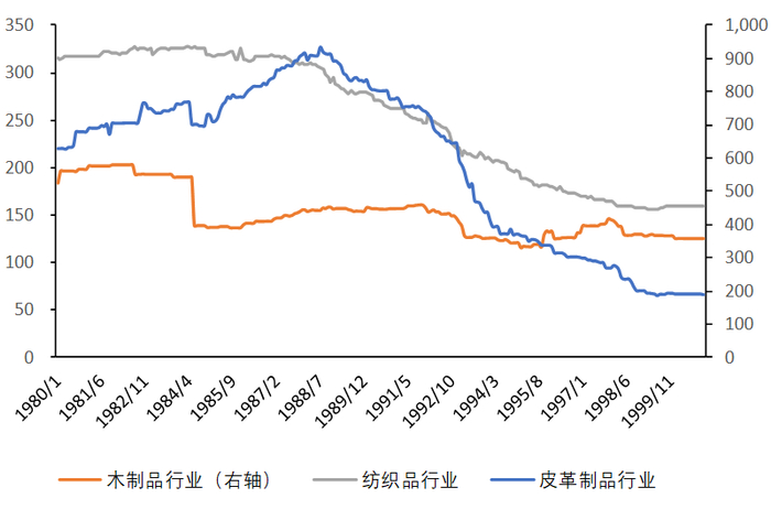 在产业外迁过程中,日本劳动密集型与资本密集型行业中行业份额减少,比较突出的集中在纺织业、钢铁、木材与纸制品,高技术行业权重在这个过程中逐步提升,经济结构持续升级。