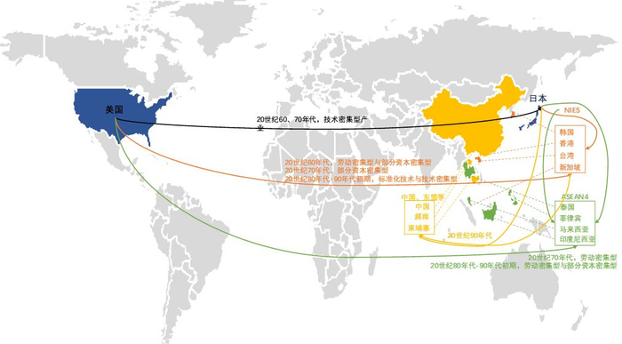 第三个阶段(20世纪80年代),美日开始向亚洲新兴工业经济体转移标准化的资本与技术密集型行业,同时美日以及部分亚洲新兴工业经济体向东盟转移劳动密集以及资本密集型行业。