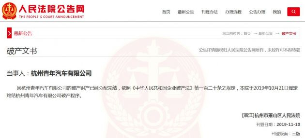 原标题:青年汽车正式破产 “加水就能跑”闹剧收场