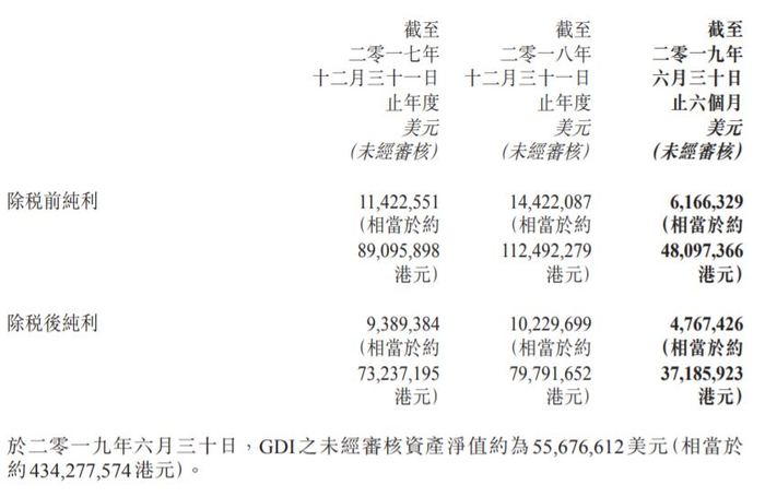 据ASL公告显示,GDI 2019年中报税后利润为476万美元(约3,719万港元),公司资产净值为5,568万美元(约4.34亿港元)。GDI此次以SPAC上市,按2018年除稅后純利来计算,市盈率约为38倍,而按2019年中报净资产值之市净率,约为7倍左右。