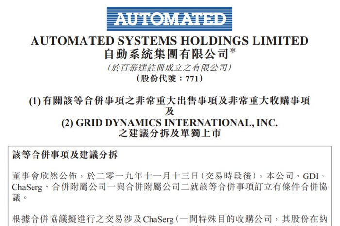 日前,香港老牌上市公司自动系统集团有限公司(HK:00771)(简称ASL)发出公告,包括「非常重大出售事项」及「非常重大收购事项」,表示持有86%股权(已计及按已兑换基准计算之GDI 优先股)的附属公司Grid Dynamic International, Inc.(简称GDI)将整体注入一家以SPAC (Special Purpose Acquisition Company)方式于美国Nasdaq上市的公司ChaSerg Technology Acquisition Corp(股票代号为CTAC)。