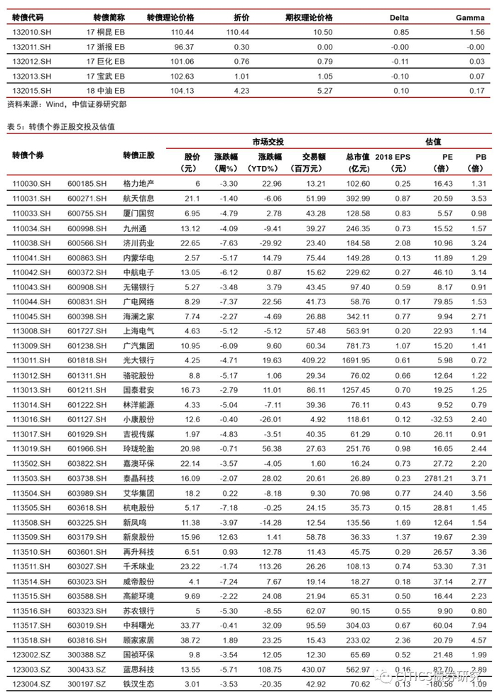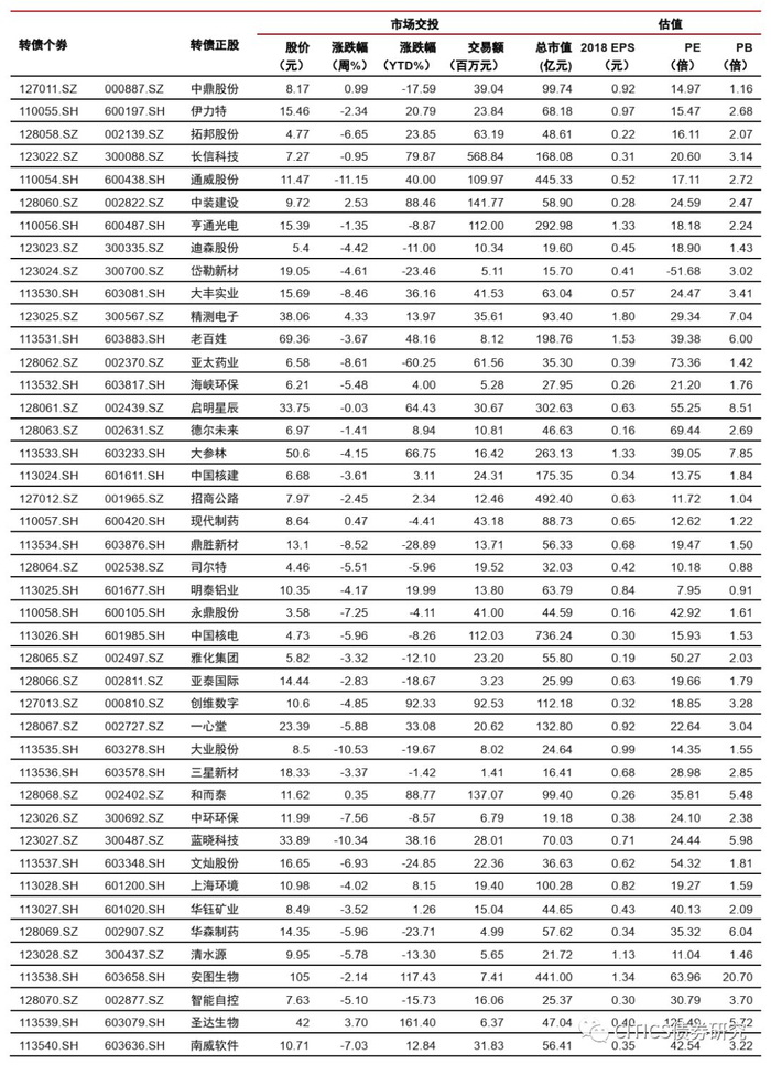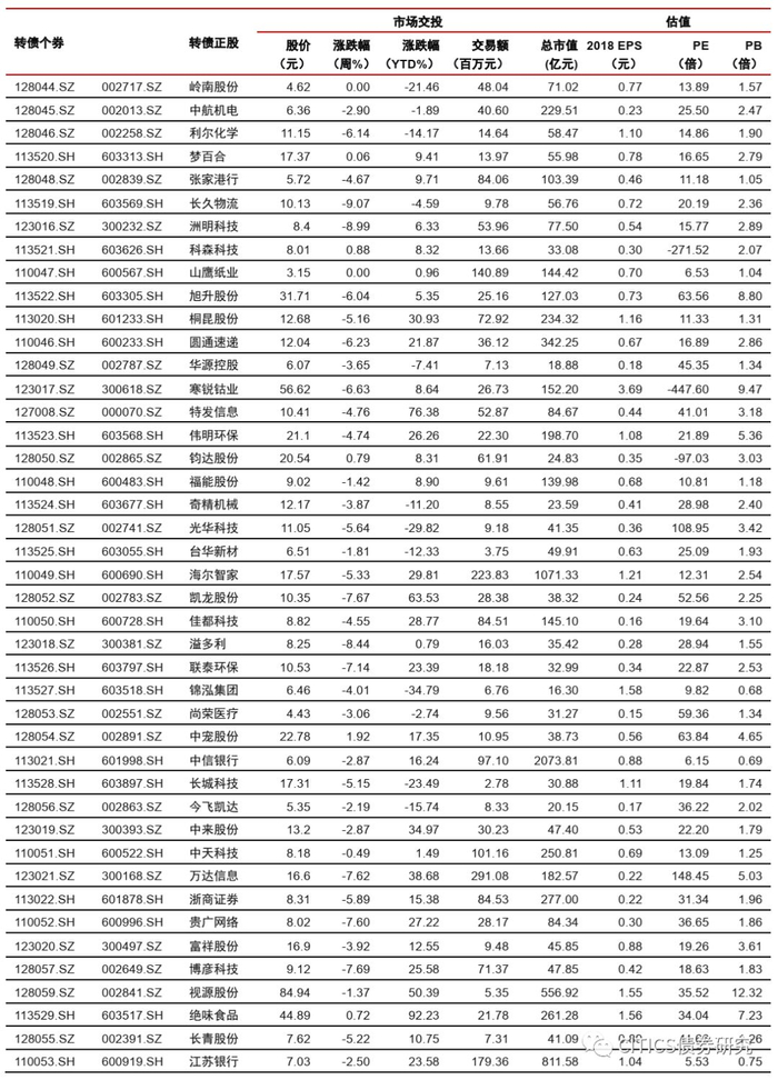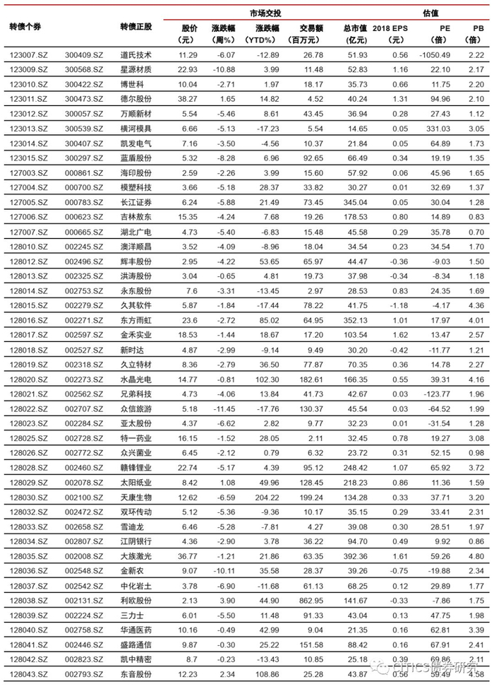 上周在182支可交易正股中,除浦发银行、荣晟环保、山鹰纸业和岭南股份横盘外,22个上涨,156个下跌,其中新泉股份(12.63%)、桃李面包(7.00%)、精测电子(4.33%)领涨,众信旅游(-11.45%)、通威股份(-11.15%)、星源材质(-10.88%)领跌。