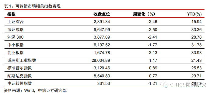 沪深两市同向变动,转债正股涨少跌多。上周上证综指下跌2.46%,沪深300下跌2.41%,沪深两市日均交易额3873.43亿元,环比下跌13.99%。中信29个一级行业中,2个上涨,27个下跌;其中电子元器件(0.25%)、食品饮料(0.05%)领涨;家电(-5.36%)、餐饮旅游(-5.20%)、农林牧渔(-5.09%)领跌。