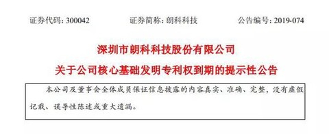 11月14日,朗科科技公告称,99专利申请日期为1999年11月14日。根据《中华人民共和国专利法》第四十二条:“发明专利权的期限为二十年,实用新型专利权和外观设计专利权的期限为十年,均自申请日起计算”,99专利的专利权期满终止日为2019年11月14日。