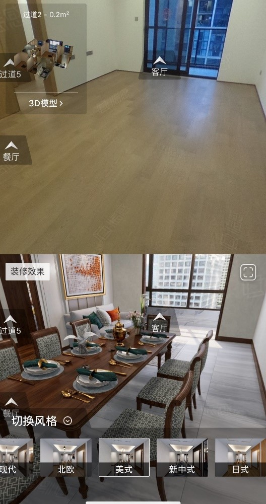 为了提升装修体验,在用户选定好的装修页面中,58同城、安居客“一键装修”功能将装修展示页面分为上下两区,上半部分呈现原始房源全景,下半部分则是装修效果,同时支持全屏观看装修效果。针对一套房源全景,“一键装修”功能可展示装修前后效果对比,用户可在多个装修风格中进行切换,在现代风、中式风、美式风等风格之间挑选喜爱的装修类别。