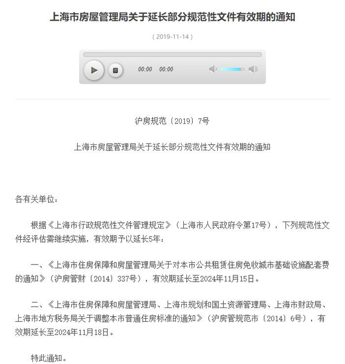 11月14日,上海市房屋管理局发布《关于延长部分规范性文件有效期的通知》,其中注明,《上海市住房保障和房屋管理局、上海市规划和国土资源管理局、上海市财政局、上海市地方税务局关于调整本市普通住房标准的通知》(沪房管规范市〔2014〕6号),有效期延长至2024年11月18日。