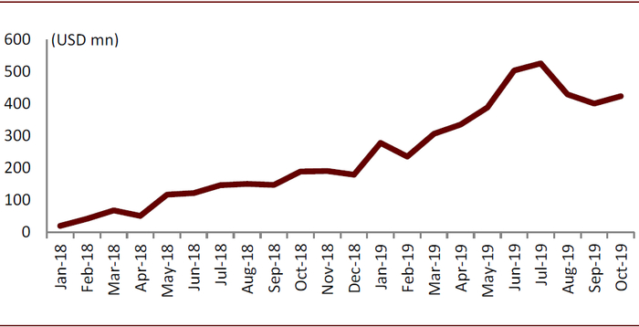 具体来看,比特币依然是目前市值和交易量最大的加密资产:截至2019年10月13日,比特币在整个加密货币市场的市值占比约为67%。以太币则以199亿美元市值稳居加密资产第二名。值得关注的是,稳定币交易已成为加密货币市场最活跃的部分。据CoinMarketCap 数据,USDT近三个月平均日交易量189.2 亿美元,已超过比特币成为加密货币交易中最主要的交易手段。