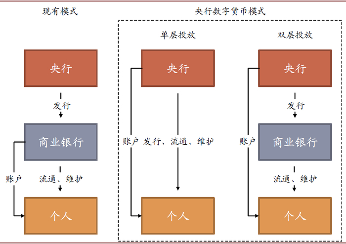 图表: 现行货币模式与单、双层架构的央行数字货币模式对比