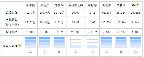 拥有392.3亿元总市值的完美世界,在文化传媒行业目前排在第三位,在整个文娱行业集体收益不理想的情况下,完美世界依然能够获得可观的盈利并持续增长,这主要得益于完美世界的游戏业务。