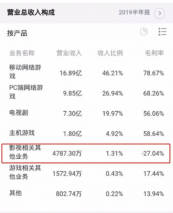 根据今年完美世界的半年报披露,游戏和电视剧皆实现盈利,唯有影视相关业务毛利率呈现负增长,好在该业务占比总收入比例并不大。然而这也从另一个角度说明了完美世界对于影视业务的忽略。