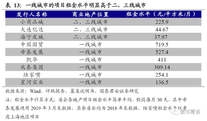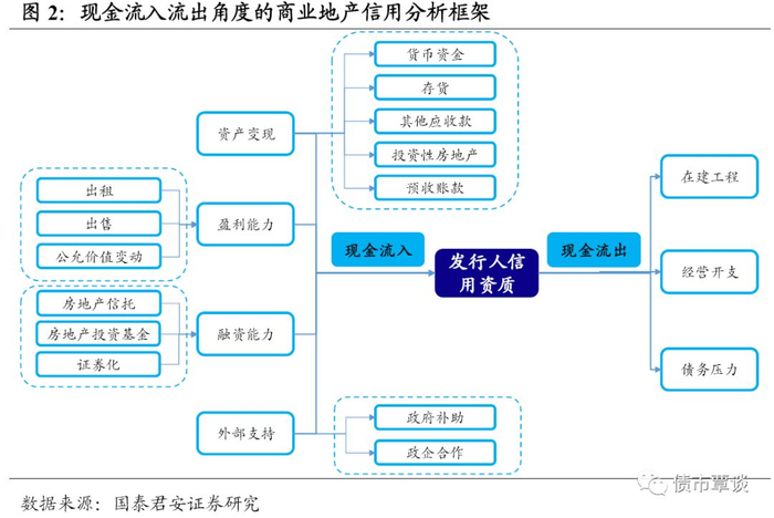 相比住宅地产的滚动开发模式,商业地产项目需要一次性投资建成,对企业的资金要求比较高,对于商业地产的信用分析主要从现金流入和流出两个角度出发,分析企业的资金压力,进而判断信用风险。