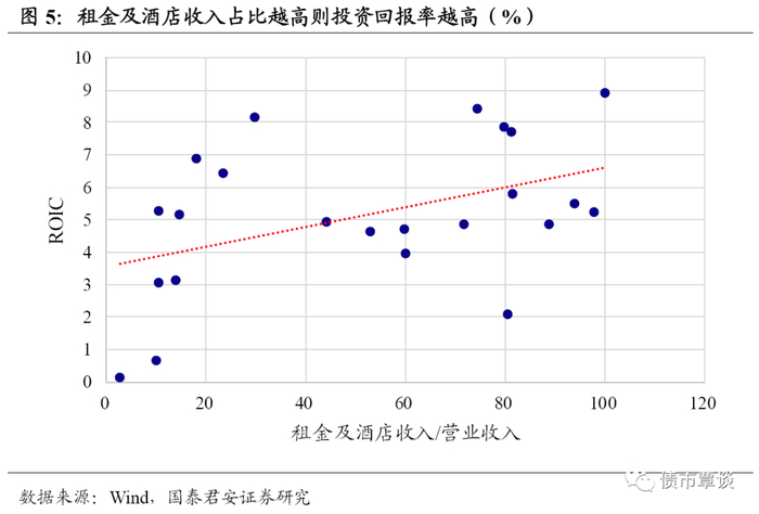 从投资回报率角度比较四种模式的盈利能力,短期来看出售模式可以获得较好的投资回报,但是长期来看出租和自营模式可以获得更加稳定的投资回报。出售模式可以通过预售在短期内回收资金,但是也失去了长期的土地增值和项目运营收益。从长期来看,出租和自营模式可以获得比较稳定的资金回报,运营一段时间后周边配套设施更加完善,其他相关业态也逐渐成熟,客流量和项目的吸引力随之增加,租金也有一定的上涨空间,同时由于开发商仍然拥有项目产权,可以享受项目土地增值收益。从房企经营数据来看,租金及酒店收入占营业收入比重更高的公司的ROIC水平也相对更高,因此从长期来看出租和自营模式下房企的投资回报率更好。