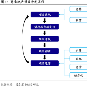 商业地产指的是非生产性、非居住性物业,包括商场、写字楼、酒店等多种业态,可以通过合理运营实现房地产升值从而获取回报。商业地产的开发流程主要包括土地或项目获取、调研及市场定位、项目建设、项目招商和项目运营五大阶段。