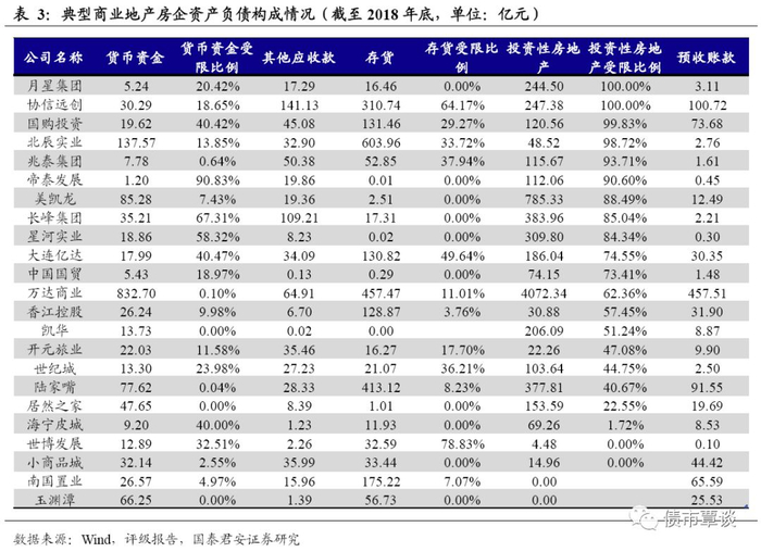商业地产企业账面资产主要是货币资金、存货、其他应收款、投资性房地产和在建工程,负债部分主要是预收账款、应付账款、其他应付款、长期借款、递延所得税负债等。其中,存货科目主要是开发产品和开发成本,其他应收款主要是往来款、押金及保证金等,投资性房地产科目主要是公司已经建成的商业地产项目。负债部分中预收类科目主要是租金和管理费收入等,预收款项可以在一定程度上缓解公司的资金压力;另外,如果公司的投资性房地产科目采用公允价值计量,则可能产生递延所得税负债。