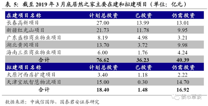 在建和拟建项目投资规模较高时,房企资金压力较大。商业地产属于资金密集型行业,项目投资规模较大,在建项目和拟建项目将使得公司面临较大的资金压力,需要关注在建工程尚需投资金额以及投资安排。以居然之家为例,截至2019年3月底,居然之家在建项目共5个,计划总投资76.62亿元,仍需投资40.39亿元,拟建项目共2个,计划投资18.40亿元,仍需投资16.92亿元,截至2019年6月底,公司账面货币资金为51.70亿元,2016年至2018年经营活动现金流量净额分别为12.52亿元、23.80亿元和26.34亿元,未来资本支出压力较大。
