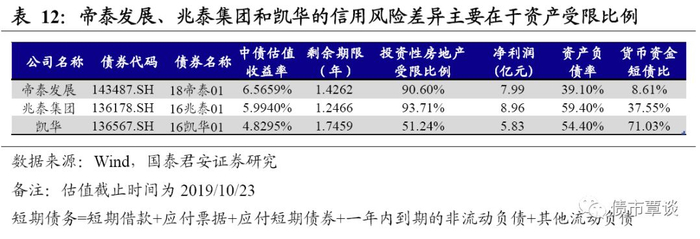帝泰发展、兆泰集团和凯华均为自持+出租模式,截至2018年末,凯华的净利润最低,但同时投资性房地产受限比例仅为51.24%,低于帝泰发展和兆泰集团,短期债务偿还能力较强,货币资金短债比达到了71.03%,且公司债券有商业物业所有权抵押担保,因此存量债收益率也处于三者中的最低水平。帝泰发展的资产负债率较低,仅为39.10%,但同时货币资金比较少,货币资金短债比仅为8.61%,短期债务偿还压力较高,加上投资性房地产受限比例高达90.60%,存量债券收益率比较高。