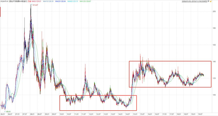 在2010-2015年,这个指数在100左右徘徊,低于100也很常见,说明那时候AH股价格相当,一度接轨,甚至A股更便宜。