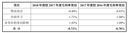 其中,物业清洁毛利率变动-1.64%、-0.81%、-0.44%,市政环卫毛利率变动-0.05%、-1.06%、-1.71%。