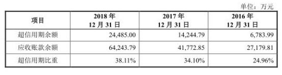 2016年至2018年,公司信用期外的应收账款余额分别为6783.99万元、1.42亿元、2.45亿元,占比分别为24.96%、34.10%、38.11%。