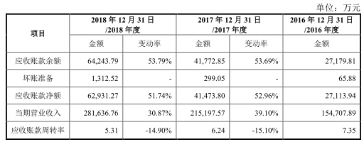 2015年至2018年,玉禾田应收账款余额分别为1.49亿元、2.72亿元、4.18亿元、6.42亿元,应收账款周转率下降,分别为7.49、7.35、6.24、5.31。