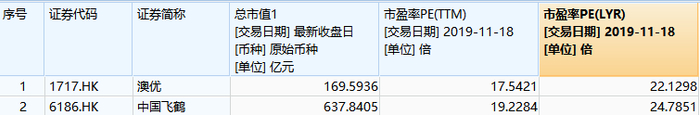 飞鹤与澳优两个同是保持高增速的乳企,以11月18日收盘价格计,澳优的市值在169.5亿元,飞鹤的市值637.8亿元。估值方面澳优的滚动市盈率为17.54低于飞鹤的19.22,静态市盈率22.12也低于中国飞鹤的24.78。