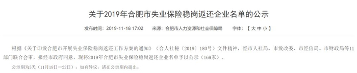 e公司记者注意到,《关于2019年合肥市暂时性生产经营困难企业名单的公示》发布于11月18日下午5点。