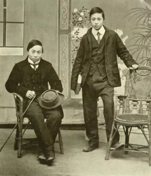 在照相馆里身穿西装拍照的两位兰溪青少年(罗安逸,1912)