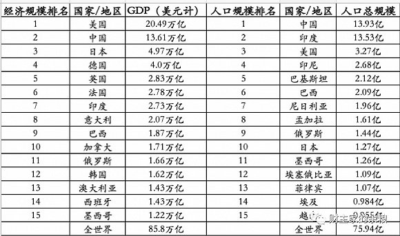 如果你把国家或某个地区视为机构的话,GDP也可以用来表示一个机构的市值情况。例如,加利福尼亚州是美国经济最强大的州,其GDP为2.9万亿美元,而2018年全球GDP总量为85.8万亿美元、人口总规模为75.94亿人,其中各自的前15名如下。