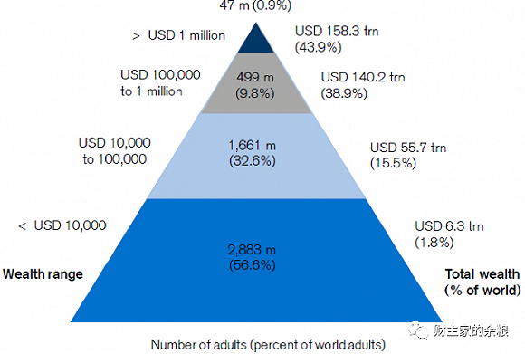 约占了全世界0.9%的4700万成年人,所拥有的财富占了全世界财富的44%——相比之下,28.83亿最低财富水平的成年人只是占了当今世界总财富规模的1.8%(6.3万亿美元)。