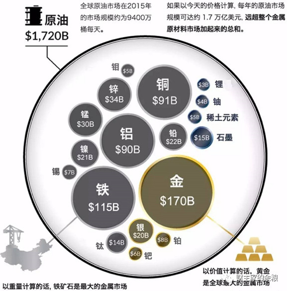 除了黄金白银之外,其他金属市场交易合约的价值,大约就相当于该类资产的总价值,具体的规模可以参见下图。不过需要注意的是,图中数据是根据2015年11月份的合约交易量和价格来统计,那个时候各大类资产价格均处于极低价格——如果以当前的价格进行折算,除黄金外的金属原材料市场未平仓合约总规模大约1000亿美元。