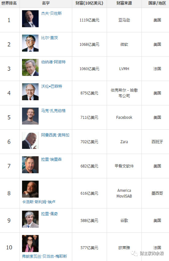 根据最新的福布斯排行榜,目前全世界最有钱的10个人及其所拥有的资产规模见下表,而位于排行榜上的这些富人,所拥有的总资产超过了2万亿美元。