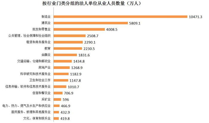 按行业分,法人单位从业人员数量位居前三位的行业是:制造业、建筑业、批发和零售业,制造业从业人员超过1个亿,稳居榜首。