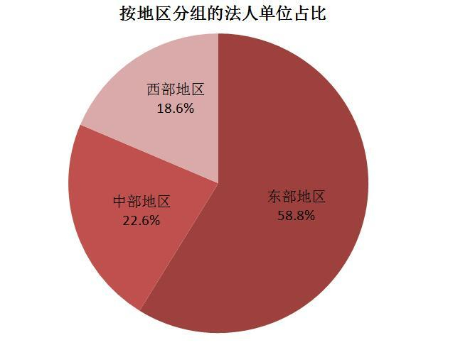 数据指出,2018年末,东部地区拥有法人单位1280.2万个,占58.8%,比2013年末下降了0.5个百分点;中部地区492.9万个,占22.6%,提高了0.1个百分点;西部地区405.8万个,占18.6%,提高了0.4个百分点。