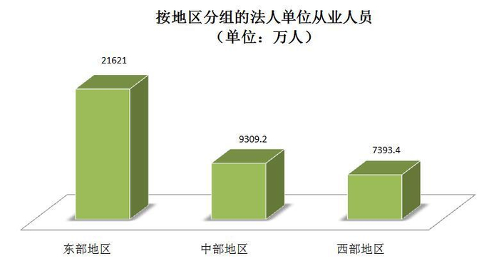 而在从业人员方面,2018年末,东部地区法人单位从业人员21621.0万人,占56.4%,比2013年末下降了1.0个百分点;中部地区9309.2万人,占24.3%,提高了0.2个百分点;西部地区7393.4万人,占19.3%,提高了0.8个百分点。