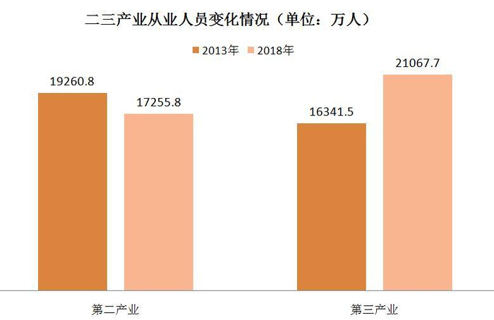 《每日经济新闻》记者也在查阅同期发布的数据后发现,2018年第二产业的从业人员人数下降10.4%;而与此同时,第三产业的从业人员人数增长28.9%。