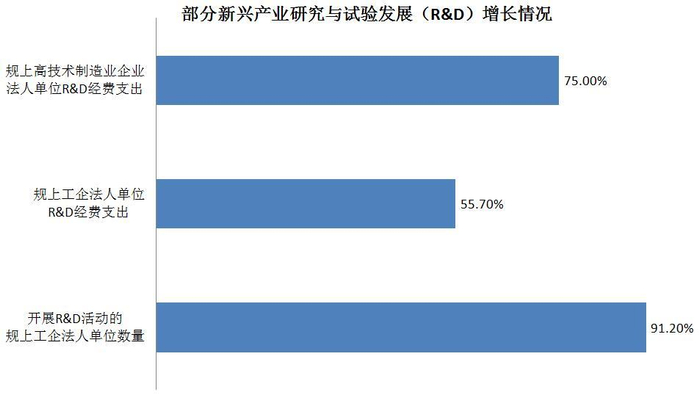 数据显示,2018年,开展R&D(研究与试验发展)活动的规模以上工业企业法人单位104820个,比2013年增长91.2%,占全部规模以上工业企业法人单位的28.0%。规模以上工业企业法人单位R&D经费支出12954.8亿元,比2013年增长55.7%;规模以上高技术制造业企业法人单位R&D经费支出3559.1亿元,比2013年增长75.0%。