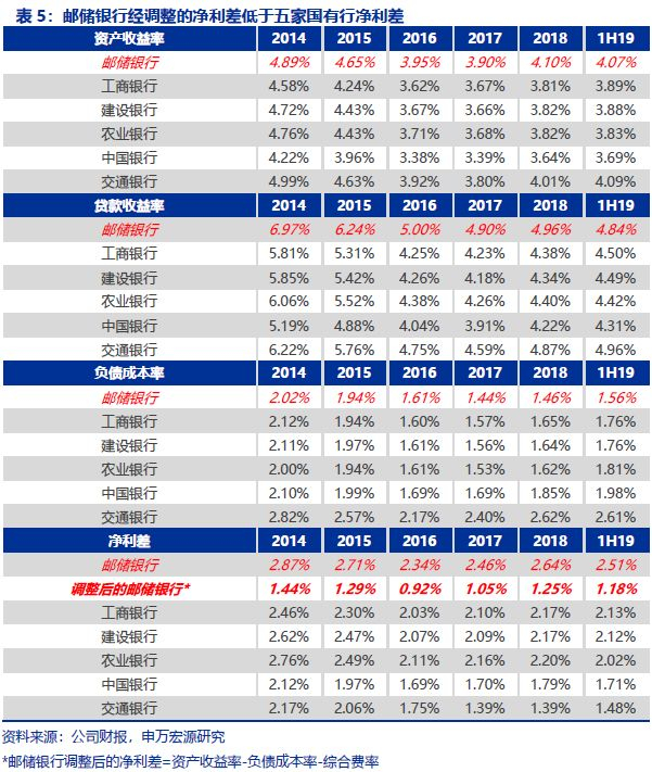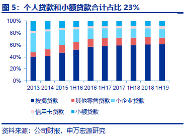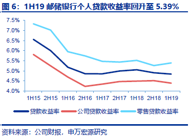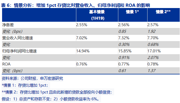2019年邮储银行开始在代理网点试行小额辅贷,这将提高高收益资产占比。自2019年5月起,邮储银行在6个省份(浙江、安徽、福建、湖南、广东和云南)的代理网点开展了小额辅贷业务,并计划在全国范围内推广这一业务模式,以进一步挖掘网点潜力。小额辅贷业务是指代理网点的工作人员在对贷款客户进行尽职调查后,向直营网点推荐客户,这样客户就可以获得直营网点批准的小额贷款。截至3Q19,邮储银行通过该运营模式向1000名客户发放了1百万元小额贷款,这意味着小额贷款的平均规模只有10万元。这一新业务有利于加强与邮政集团的合作,并激发代理网点的活力。我们基于1H19财报数据进行了情景分析,邮储银行存贷比每增加1pct,其净息差将增加0.85bps,营业收入和净利润增速将分别增加0.3pct、0.91pct,同时ROA提升0.61bps至0.77%。在此基础上,如果邮储银行将新增贷款投向小微领域(假设其收益率为6%),净息差将增加1.92bps,营业收入增速和净利润增速将分别增加0.68pct、2.07pct,ROA将增加1.37bps至0.78%(见表6)。截至2Q19,个人贷款和小额贷款合计占贷款总额的比例为23%,占比高于五家国有行。在流动性宽松的情况下,个人贷款收益率与市场利率的关联性并不像企业贷款那么强。因此,1H19邮储银行个人贷款收益率回升至5.39%,而企业贷款收益率仍处于下降趋势。我们认为,通过在代理网点投放小额辅贷有助于持续优化资产结构,从而提高净息差和ROA。