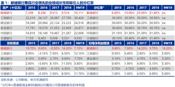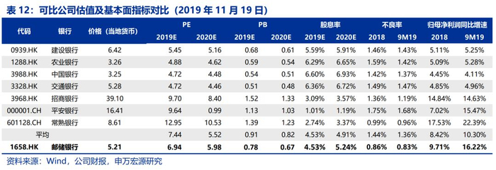 我们认为邮储银行未来三年业绩增速将高于同业平均水平,并保持30%以上的股息支付率。邮储银行结合了国有行、股份行和村镇银行的优点,兼具成长性和行业领先的股息率。我们认为邮储银行在未来三年可以实现高于同行平均水平的业绩增长。我们假设其不良率保持稳定,净息差小幅下降,资产增速维持在9%,那么2019-2021年的净利润同比增速预计分别为16.2%、15.0%和15.0%。若邮储银行ROE提升,2020年其净利润同比增速将至少达到17.9%。我们认为在其资产质量稳健的情况下,邮储银行ROE上升的势头将有助于提高估值。同时,我们认为邮储银行将保持与五家国有行相当的30%的股息支付率。自邮储银行在港交所上市以来,其派息率从15.0%提高到31.4%,在中国上市银行中位居前列。自2019年起,银监会将邮储银行作为国有银行进行监管,我们认为其派息率将保持在30%左右。以2019年11月19日收盘价测算,邮储银行2019年的股息率预计为4.53%。
