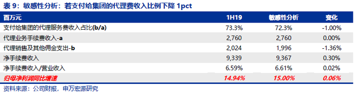 2)向集团支付的代理费比例:根据双方协议,邮储银行应向邮政集团支付一定比例的代理银行中间业务收入。我们将邮储银行和邮政集团的合作扩张空间看作是邮储银行未来业绩增长点。2018年代销手续费和其他手续费(即支付给邮政集团的代理收入)占代理业务收入的88%。根据敏感性分析,基于1H19数据,支付给集团的代理费收入比例每下降1pct,手续费净收入占营业收入的比重将上升2bps至6.61%(见表9)。我们认为与邮政集团之间的合作进一步加强是邮储银行未来业绩增长重要的驱动力。