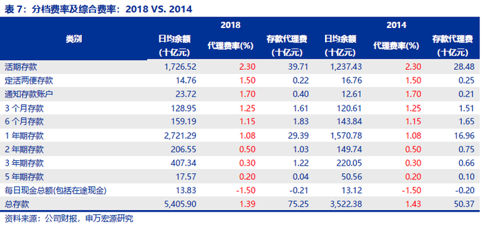 1)综合费率:根据《代理银行业务框架协议》,邮储银行按以分档费率与每档储蓄存款日均余额计算得出的综合费率向集团缴纳储蓄代理费。近年来受益于存款结构的优化,综合费率持续下降。1H19邮储银行综合费率为1.33%,较2018年下降了6bps。根据敏感性分析,综合费率每下降1bp,净利润同比增速将上升0.66pct(见表8)。