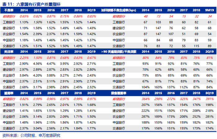 受益于“杠铃式”信贷策略,邮储银行资产质量更为优秀,拨备覆盖率更高。邮储银行在资产质量指标上全面优于国有五家国有行(见表11)。(1)不良率和加回核销的不良生成率:邮储银行不良率自2013年以来一直低于1%。截至3Q19,邮储银行不良率为0.83%,较年初下降3bps,比五家国有行低54-65bps。此外,邮储银行加回核销的不良生成率一直低于五家国有行,尤其是在不良贷款爆发的2015-16年。(2)潜在不良压力:邮储银行关注率和逾期率一直低于五家国有行。截至2Q19,邮储银行关注贷款率和逾期贷款率分别仅为0.67%和0.97%,而五家国有行均值分别为2.64%和1.53%。(3)不良认定标准:邮储银行不良认定标准严格。截至2Q19,邮储银行90天以上逾期贷款/不良贷款为81%。根据其3Q19业绩会公布信息,逾期超过60天的贷款已经全部被认定为不良贷款。(4)拨备覆盖率:邮储银行在国有大行中拨备覆盖率最高。截至3Q19,邮储银行拨备覆盖率达到391%,比300%的上限高出91pct。在9月27日财政部发布《金融企业财务规则(征求意见稿)》后,我们认为邮储银行将合理计提拨备并更加从严认定不良贷款。优于同业的资产质量将有助于邮储银行实现领先行业的盈利增长。随着邮储银行加大信贷投放力度,投资者应当关注其资产质量变化。鉴于邮储银行风控能力的快速发展以及管理层对于风险控制的决心,我们对邮储银行资产质量持乐观态度。