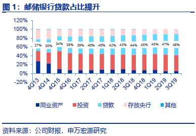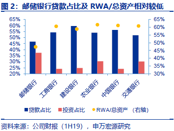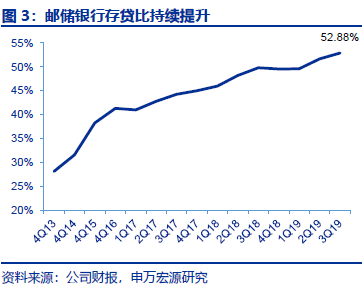 邮储银行成立于2007年,其开展贷款业务的时间晚于其他商业银行。截至2013年末,邮储银行资产中有27%是同业资产,27%是贷款,23%是债券投资;负债中有22%是央行存款。所以,与另外五家国有行相比,邮储银行风险加权资产占比总资产的比重较低且杠杆率较高,并由此形成了较高的ROE。同时,邮储银行存款基础稳固,3Q19超过90%的负债来自存款。但是其信贷杠杆并未有效利用,2013年末其存贷比为28.1%,近几年通过优化资产结构逐步提升资金使用效率,3Q19贷款占比提升至47.9%,存贷比上升至52.9%。