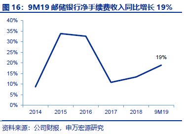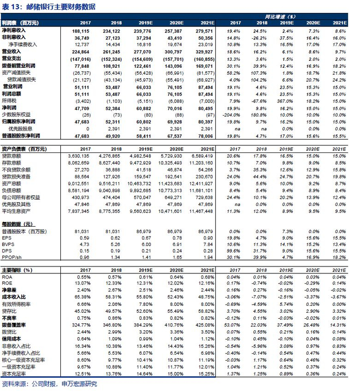 邮储银行具备强大的客户基础、网点覆盖及营销能力,银保市场份额居银行业首位,手续费收入增长潜力较大。在银行与集团合作关系的重塑下,其未来手续费净收入有望保持快速增长。我们预计2019-2021E手续费净收入同比增速分别为16.5%、17.0%、17.0%。